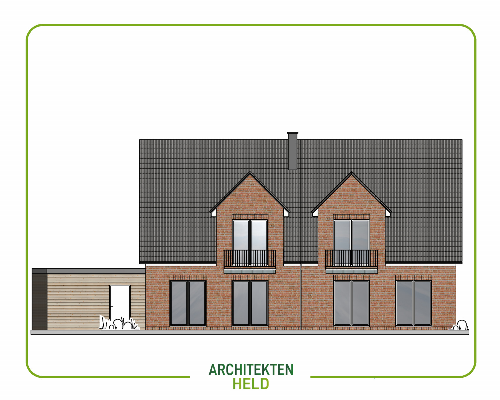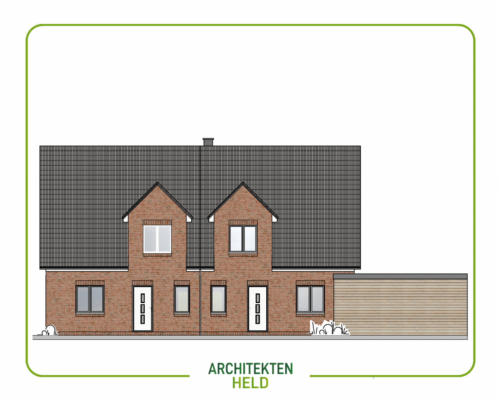 Dieses Doppelhaus mit Carport und Spitzbodenausbau und 115 m² Wohnfläche pro Haushälfte haben wir auf Kundenwunsch und grundstücksoptimiert angefertigt.